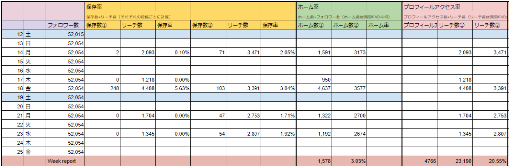 今週も頑張ってレポートしていきたいと思います。今回は、毎週の保存率・ホーム率レポートに加えて、二週間ごとのプロフィールアクセス率についてモニタリングしていきたいと思います。